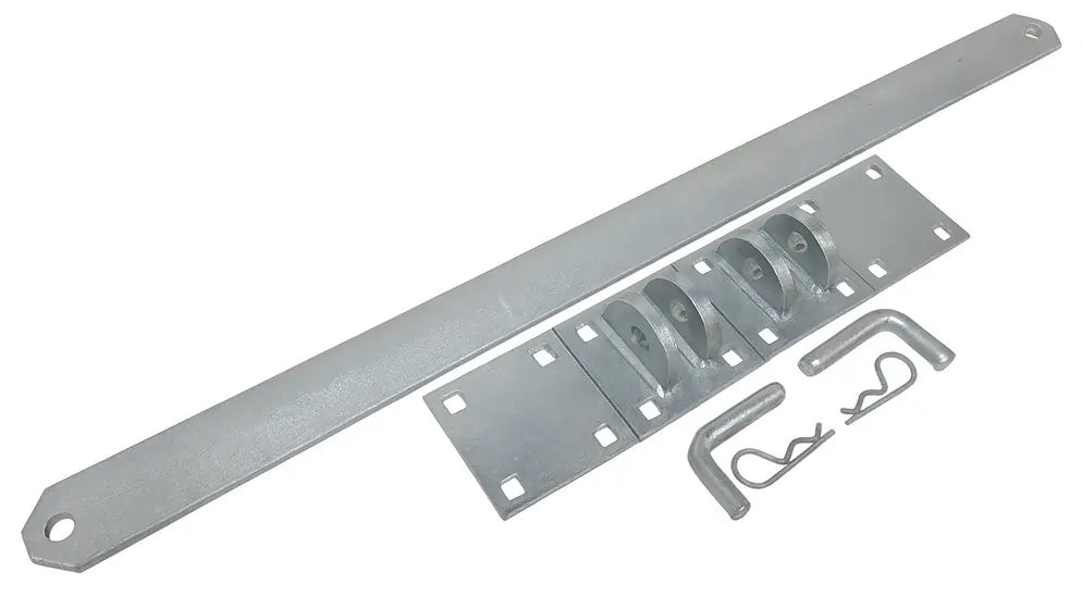 This complete kit includes a 48" x 3/8" galvanized brace (DH-FPS), two DH-TF Female Ears with welded 1/2" round ears on 5" x 5" x 1/4" plates, two DH-B 5" x 5" backer plates, and two DH-PIN3 connector pins (1/2" x 3") with hitch clips. Each DH-TF plate comes pre-punched with 9/16" square holes, sized for use with 1/2" carriage bolts (not included).