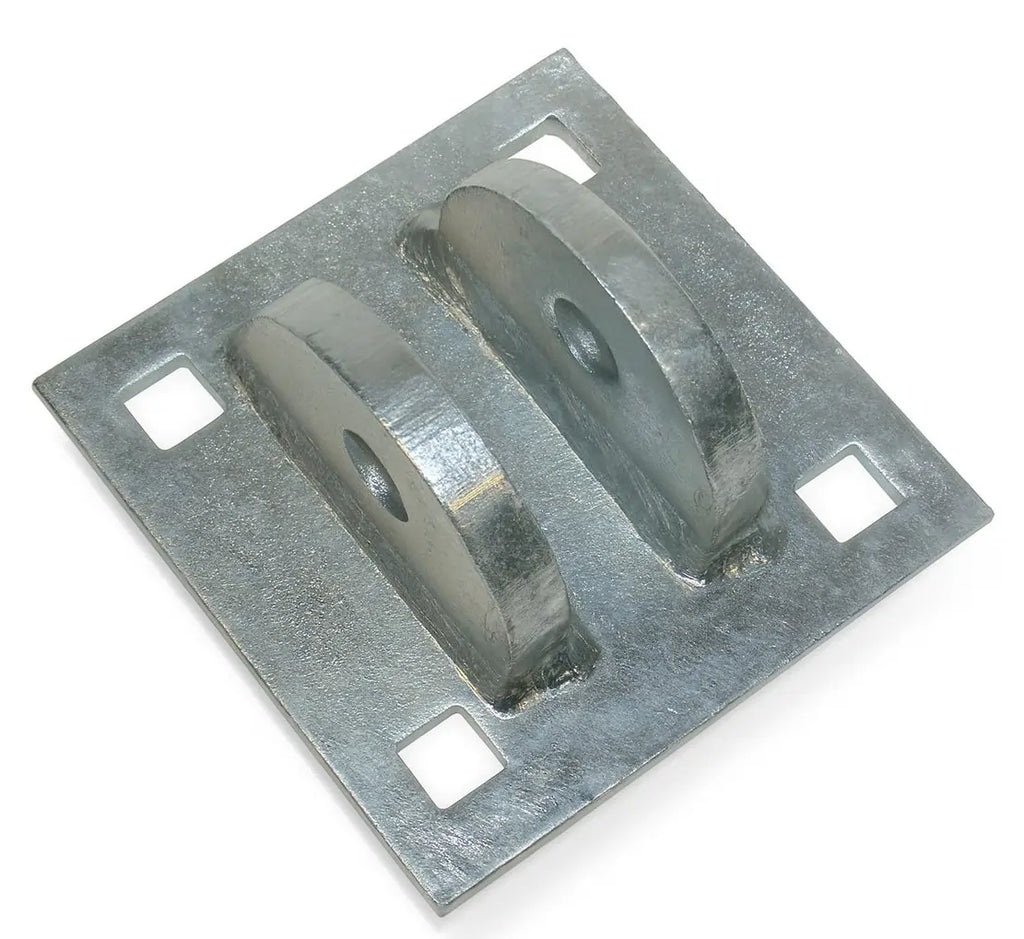 The 5" x 5" galvanized base plate includes pre-punched 9/16" square holes (3.5" between centers) sized for 1/2" carriage bolts, ensuring fast, accurate installation. Reinforced with (2) welded 1/2" ears, the DH-TF provides a strong hinge point for floating dock systems. For maximum durability, pair this connector with the Dock Hardware DH-B Backer Plate. It mates seamlessly with the Dock Hardware DH-TM T-Male Connector or DH-M Male Corner Connector when used with the DH-PIN3 Connector Pin.